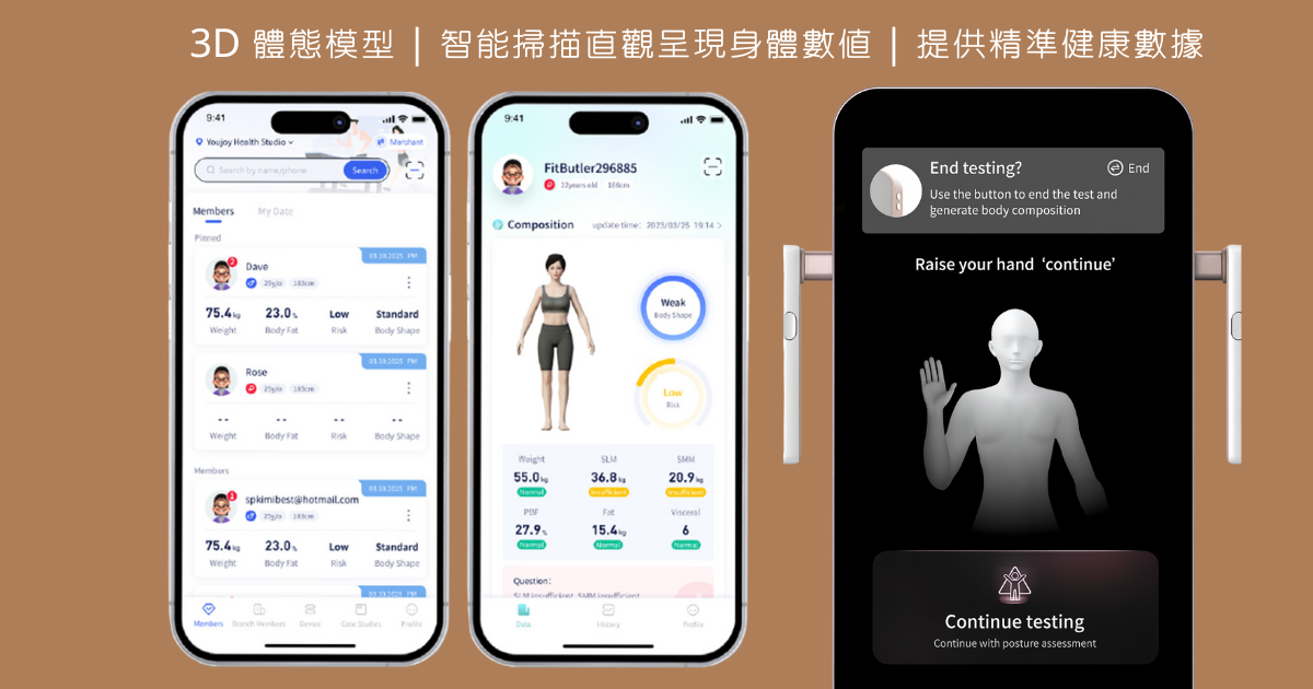 結合 AI 科技與專業體測技術的智能體態檢測設備,專為健身房、健康管理中心及個人用戶打造。它能提供全面、精準且可追蹤的身體數據,幫助使用者了解自身狀態並制定更合適的運動計畫。